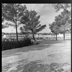 "Parque municipal Alcalde Pons , Les Basses; piscines amb banyistes i vestidors al fons"