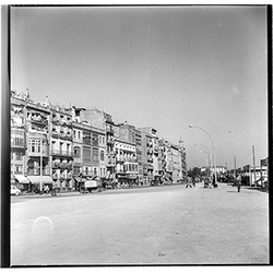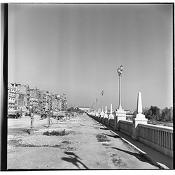 "Avinguda de Madrid; obres d’urbanització; edifici de l’antic Gota de Llet, Dispensari Municipal i Casa de Socorro, antigament també va fer funcions de laboratori municipal, al Banco d’España i el Mercat de Sant Lluís al fons"