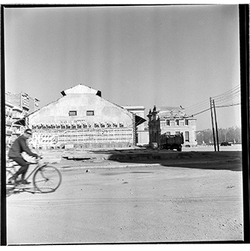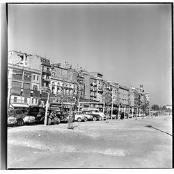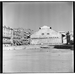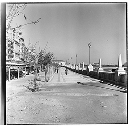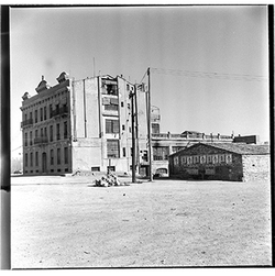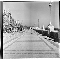 "Avinguda de Madrid; obres d’urbanització; edifici de l’antic Gota de Llet, Dispensari Municipal i Casa de Socorro, antigament també va fer funcions de laboratori municipal, al Banco d’España i el Mercat de Sant Lluís"