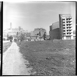 "Carrer Sant Joan de Mata i Camí Vell d'Albatàrrec; obres d’urbanització; al fons la Seu Vella; 1965"