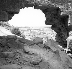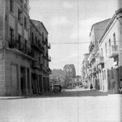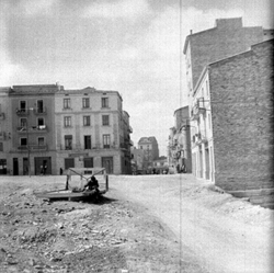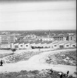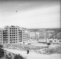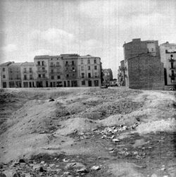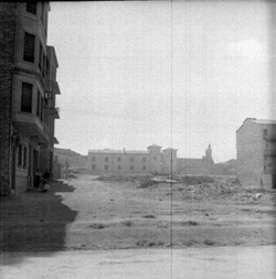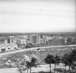 "El Camp de Mart, des del Turo de la Seu Vella; al fons els magatzems de Regiones Devastadas"