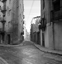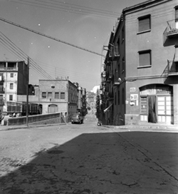 "Inici del Carrer de Sant Carles, a la vora del Pla dels Gramàtics, amb el mercat del Pla a la dreta"