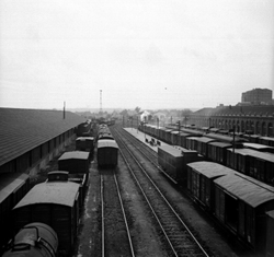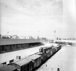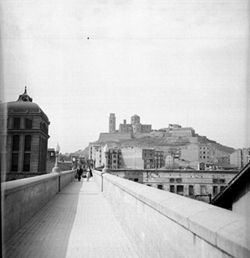 "Estació de ferrocarril, des de la passarel·la peatonal; al fons la Seu Vella"