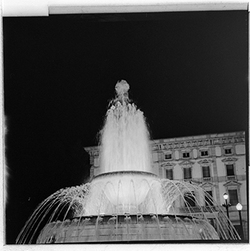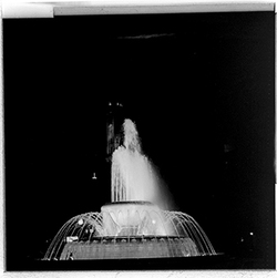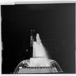 "Font de la Plaça de la Pau, davant del Govern Civil; al fons el campanar de la Seu Vella, il·luminat"