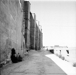 "Construcció del mur de contenció per ampliar l’Avinguda de Madrid; vista des del marge dret del riu; al fons els Camps Elisis"