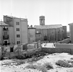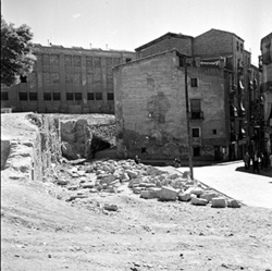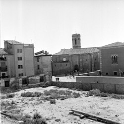 "Ruïnes del Palau dels Marquesos de la Tallada, antic Palau Episcopal; a la dreta, les cases del Carrer de la Cotxera, i al fons la Plaça Cervantes i la Rambla d’Aragó"