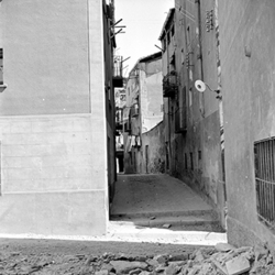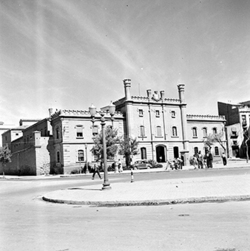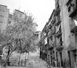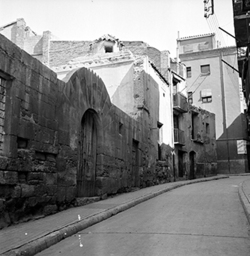 "Ruïnes del Convent de l’Ensenyança; a la dreta, Carrer de la Palma; al fons Edifici del Roser i Carrer de Sant Domènech"