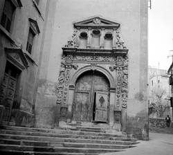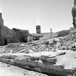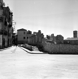"Ruïnes del Palau dels Marquesos de la Tallada, antic Palau Episcopal; al fons la Plaça i església de Sant Llorenç"