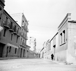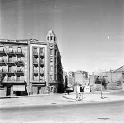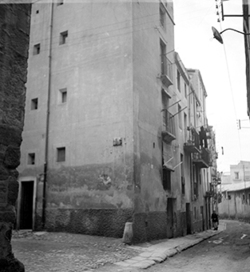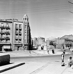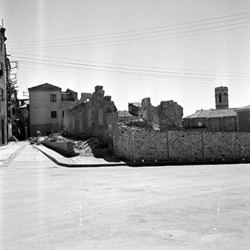 "Plaça de Cervantes i Rambla d’Aragó; ruïnes del Palau dels Marquesos de la Tallada, antic Palau Episcopal; al fons la Plaça i església de Sant Llorenç; a l’esquerra Carrer de la Cotxera"