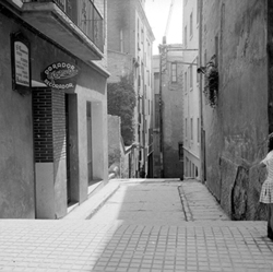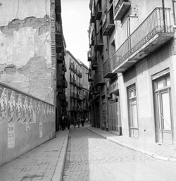 "Carrer de les Carmelites, des de la Plaça de la Catedral; al fons el Carrer de Sant Anastasi"