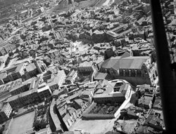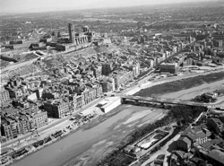 "Vista aèria de la ciutat des de la vertical del riu Segre, al sud; elements destacables en primer terme: la Seu Nova, el Convent de Santa Teresa i la Maternitat"