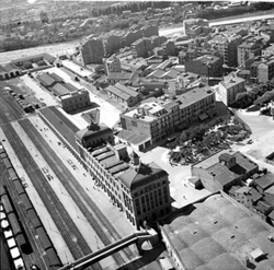 "Vista aèria de la ciutat des del nord; vertical aproximada de l’Avinguda Alcalde Recasens; elements destacables en primer terme: estació del ferrocarril i Plaça Berenguer IV, al final de la Rambla de Ferran"
