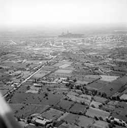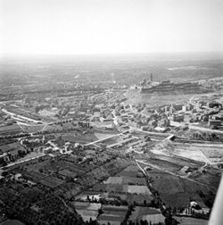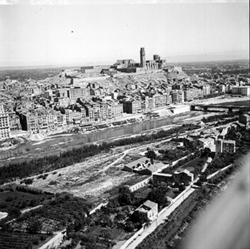 "Vista aèria de la ciutat des del nord; elements destacables en primer terme: zona de camps que correspondrien als actuals barris de Secà de Sant Pere i zona de la carretera d’Osca"