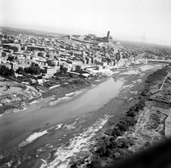 "Vista aèria de la ciutat des del sud-est; vertical aproximada del riu Segre; elements destacables en primer terme: terrenys de la futura Avinguda de Madrid"