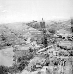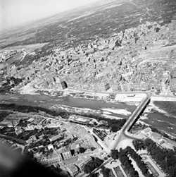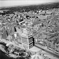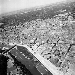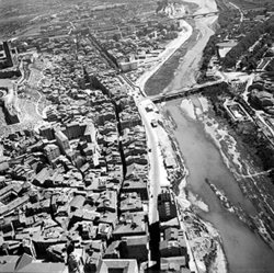"Vista aèria de la ciutat des del nord; vertical aproximada l’actual Passeig de Ronda; elements destacables en primer terme: l’Avinguda Prat de la Riba (aleshores General Mola), el Carrer Humbert Torres i el Camp de Mart, més llunyà"