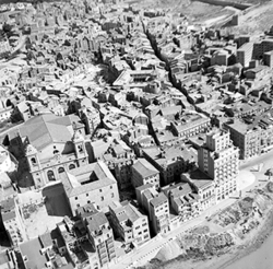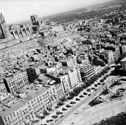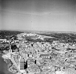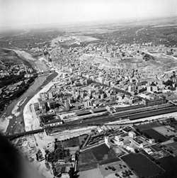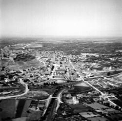 "Vista aèria de la ciutat des de l’est; vertical aproximada del barri de Pardinyes; elements destacables en primer terme: el Carrer Príncep de Viana, l’Avinguda Prat de la Riba (aleshores General Mola), i la zona d’expansió de Balàfia; al fons el Turó de la Seu Vella"