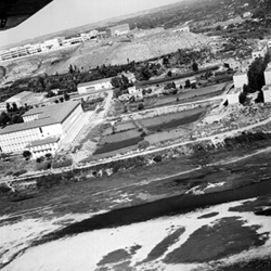 "Vista aèria de la ciutat des de l’est; vertical aproximada del riu Segre; elements destacables en primer terme: terrenys de la futura Avinguda de Madrid, i edificis de l'Antic Hospital de Santa Maria, Montepio i Seu Nova; al fons el Turó de Gardeny"