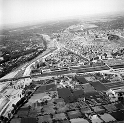 "Vista aèria de la ciutat des del sud-est; vertical aproximada del barri de Pardinyes; elements destacables en primer terme: l’estació del ferrocarril i la Rambla de Ferran; al fons el Turó de la Seu Vella"