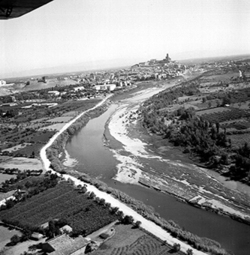 "Vista aèria de la ciutat des del sud; vertical aproximada del riu Segre; elements destacables en primer terme: partida de Rufea, el riu i de Sot de Fontanet - Copa d’Or, camí d'Albatàrrec"