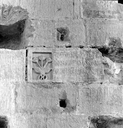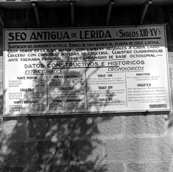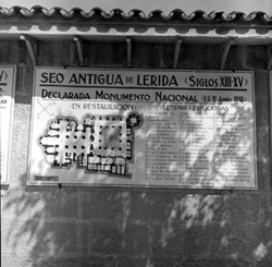 "Plano de la Seo Antigua de Lérida ; plànol de la Seu Vella, penjat a la paret exterior de l’antiga caserna de Cavalleria, al Turó de la Seu Vella"