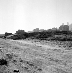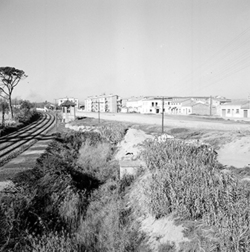 "Zona de Balàfia; terrenys annexos a la línia del ferrocarril, actualment soterrada i convertida en el segon Passeig de Ronda; al fons els blocs Franco de Gaminde el Carrer de la Cerdanya; en primer terme el Carrer del Vallès"