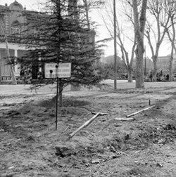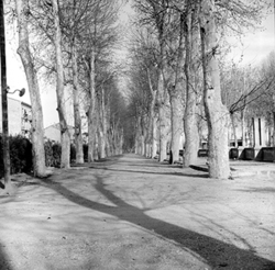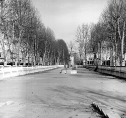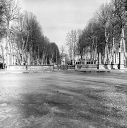 "Camps Elisis; passeig central entre els arbres plataners; al fons el monument construït per l’organisme “Regiones Devastadas” al final del passeig"