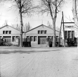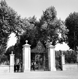 "Camps Elisis; entrada lateral, entre arbres, des de l’antiga Carretera Nacional II (antiga Avenida de los Mártires, i actual Avinguda Josep Tarradellas)"