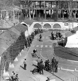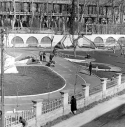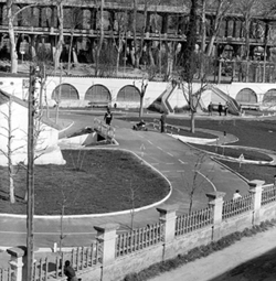 "Camps Elisis; parc infantil Ana Mari ; amb circuit per a karts i pràctiques d’educació vial, on un grup de persones observa els vehicles; vista presa des del domicili particular de Lluís Terrés Pàmpols, al Carrer de Santa Cecília; al fons el nou pavelló de vidre al passeig central"