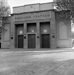 "Camps Elisis; edifici de l’antic teatre, Pavellón Frutero de la Fira de Sant Miquel i actual Pavelló Poliesportiu Antorxa; façana"