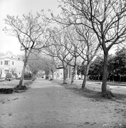 "Camps Elisis; jardins; al fons es veu el solar annex al l’edifici de l’antic teatre, Pavellón Frutero de la Fira de Sant Miquel i actual Pavelló Poliesportiu Antorxa, on es construirà la piscina coberta"