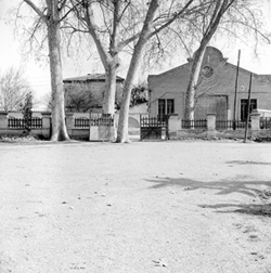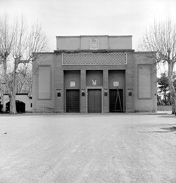 "Camps Elisis; edifici de l’antic teatre, Pavellón Frutero de la Fira de Sant Miquel i actual Pavelló Poliesportiu Antorxa; façana"