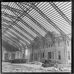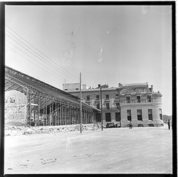 "Enderrocament de l’estructura metàl·lica del Mercat de Sant Lluís. \nAl costat esquerra es veu la Casa de la Lira o casa Morera."