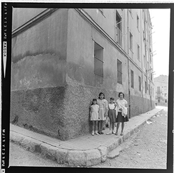 "Carrer Jaume I El Conqueridor; un grup de noies joves i nens mira la càmera"