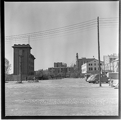 "Enderrocament de l’estructura metàl·lica del Mercat de Sant Lluís; al fons l’antic Gota de Llet, Dispensari Municipal i Casa de Socorro, antigament també va fer funcions de laboratori municipal i el Banco de España."