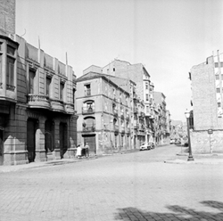 "Plaça del Treball, amb la unió entre els carrers Príncep de Viana (esquerra) i Pi i Margall (Calvo Sotelo), dreta; l’edifici de l'Escola del Treball, marca l’inici del Carrer Alfred Perenya; en primer terme a la dreta, xamfrà amb el Carrer Ramon Llull"