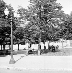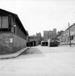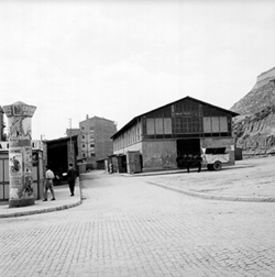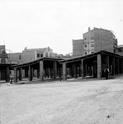 "Antic mercat de la Magdalena i Carrer de la Parra, al costat del vessant del Turó de la Seu Vella; es veuen diversos quioscos de venda de begudes"