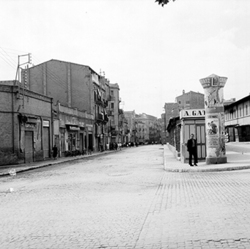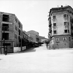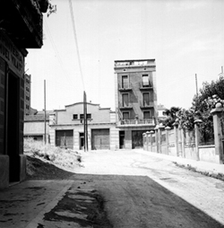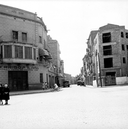 "Carrer Pi i Margall (antic Calvo Sotelo); al fons a l’esquerra hi ha edifici de l'Escola del Treball; més a prop, inici del Carrer de la Premsa. ESCUELA DE MAESTRIA INDUSTRIAL"