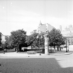 "Antic mercat de la Magdalena, des de la Plaça Mossèn Jacint Verdaguer i del Carrer Pi i Margall (antic Calvo Sotelo), al costat del vessant del Turó de la Seu Vella; es veuen diversos quioscos de venda de begudes; en primer terme un pirulí informatiu"