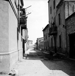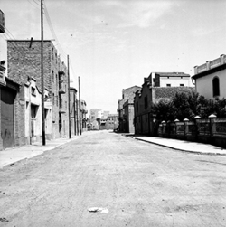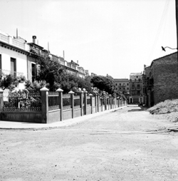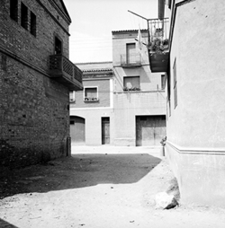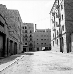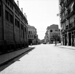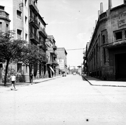 "Carrer Pi i Margall; al fons, el xamfrà amb l ‘Avinguda Prat de la Riba; a l’esquerra hi ha l’edifici del Frontón de Lérida"
