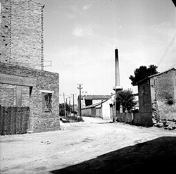 "Carrer Pallars, xamfrà amb l'Avinguda Alcalde Porqueres, antiga carretera nacional núm. 230; al fons es veu la xemeneia de l’antiga fàbrica - bòbila Ticó, coneguda de manera informal com La Sulfuro que ocupava el lloc on actualment hi ha la Plaça de la Constitució o del Clot de les Granotes"