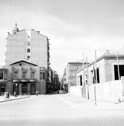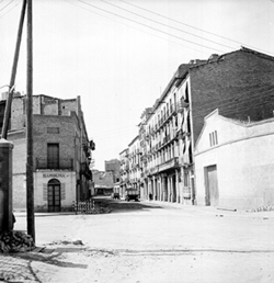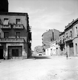 "Carrer Príncep de Viana des de la cruïlla del carrer Sant Ruf. A la dreta es veu una part de la Barberia del Sr. Miñano. Al fons es veu la plaça Ramon Berenguer IV."