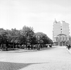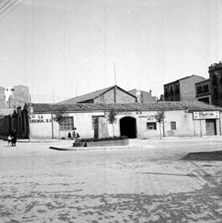 "Plaça Mossèn Jacint Verdaguer, amb l’edifici de La gremial ; a l’esquerra comença el Carrer Pi i Margall"