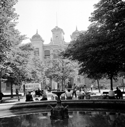 "Plaça Ramon Berenguer IV, annexa a l’estació del ferrocarril, la qual es veu al fons; en primer terme els jardins enmig de la plaça, amb la font decorativa i l'estany"