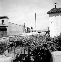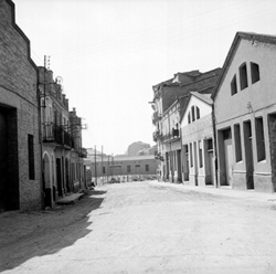 "Part del darrera de les cases que donen al Carrer Príncep de Viana, al davant de la Plaça del Treball; el que seria actualment el Segon Passeig de Ronda; al fons es veu el pont sobre el ferrocarril corresponent al Carrer de les Corts Catalanes"