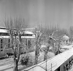 "Pavelló Antorxa dels Camps Elisis amb una gran nevada; al fons es veu el Quiosc de la Música i el passeig central coberts per la neu; vista des del domicili particular de Lluís Terrés Pàmpols al Carrer de Santa Cecília; barri de Cappont"
