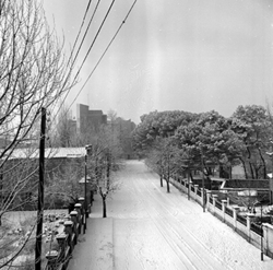 "Carrer de Santa Cecília cobert per la neu; a la dreta, vista parcial dels Camps Elisis, i al fons l'Avinguda de les Garrigues; vista des del domicili particular de Lluís Terrés Pàmpols al Carrer de Santa Cecília; barri de Cappont"