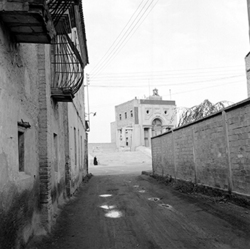 "Estreta sortida del Carrer Ramon a la Plaça de les Missions; al fons hi ha el Santuari de Santa Teresa (Teresina)"