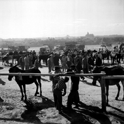 "Antic Firal de Bestiar situat al barri de Pardinyes, entre l’actual Avinguda de Tortosa i el Riu Segre; detall dels tancats de bestiar, amb vaques i vedells i cavalleries, i diverses persones observant"