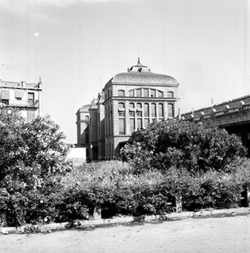 "Plaça Edil Saturní, annexa a l’estació del ferrocarril, la qual es veu al fons; en primer terme uns jardins i la part del darrera dels edificis que tenen façana a la Plaça Ramon Berenguer IV"
