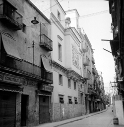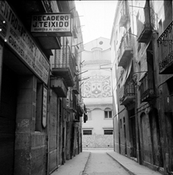 "Travessia del Carme; al fons, el Carrer del Carme i la façana de l’església parroquial"